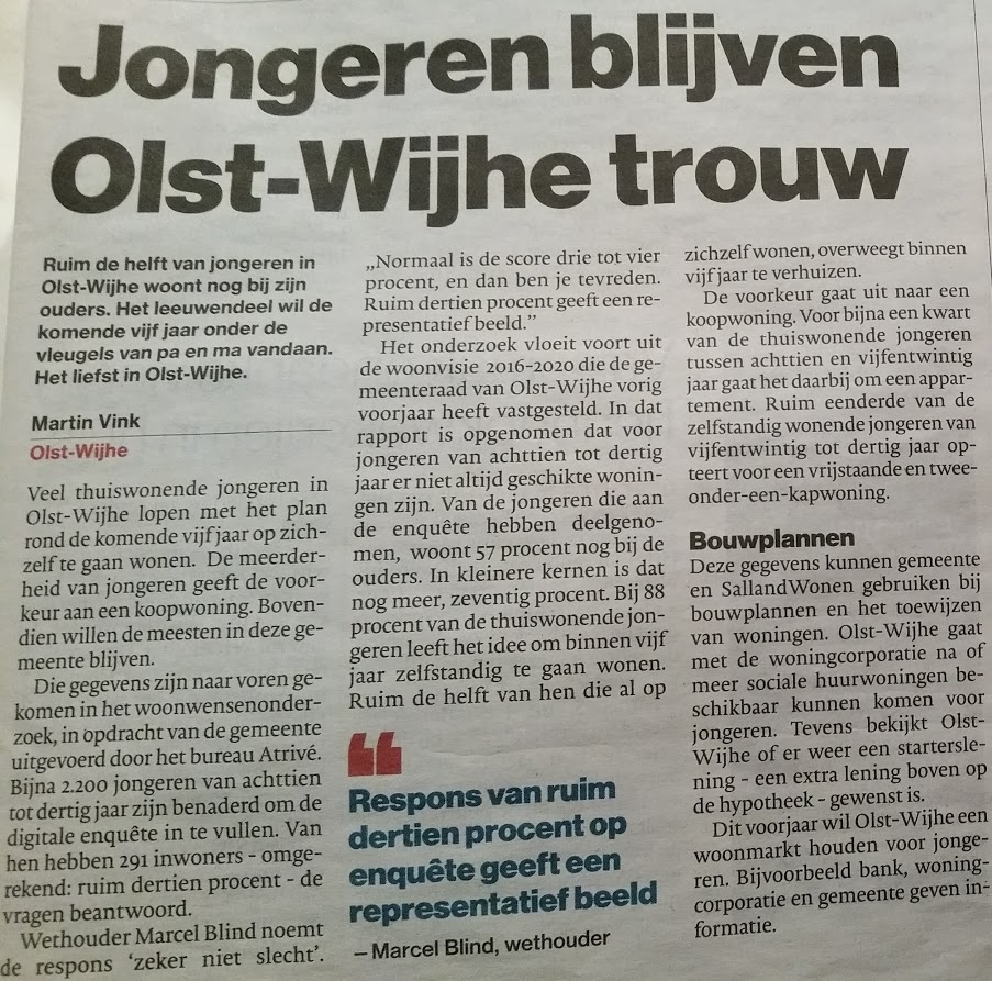 De gemeente Olst-Wijhe heeft gisteren de resultaten van de enquete die is uitgezet onder jongeren, met betrekking tot wonen in onze gemeente, bekend gemaakt. Daardoor kon u daarover vandaag in de Stentor al wat lezen, zie ook het bericht dat hiernaast wordt afgebeeld.