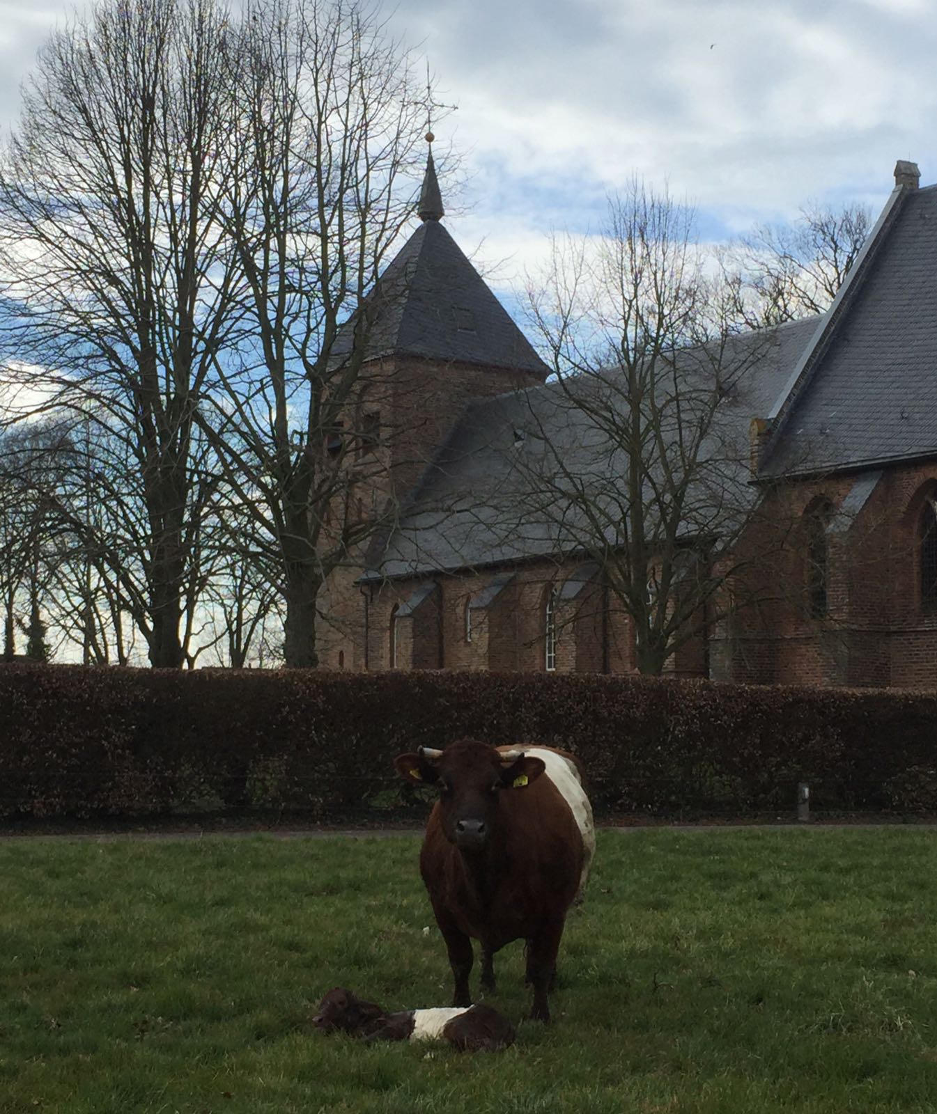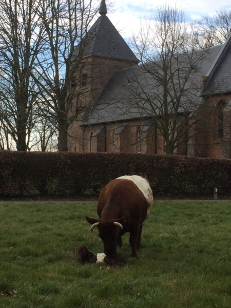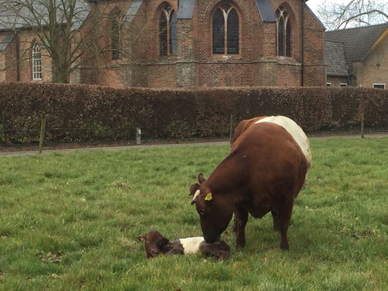 Dat is een vrolijk pasen voor Anton & Annet Niemeijer. Het eerste lakenvelder kalfje gisteren geboren en staan gezellig samen in de wei.
