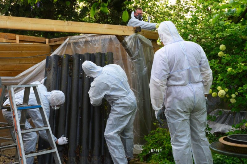 Vanaf 8 uur in de ochtend ging een team van 4 mannen in de bekende ‘witte pakken’ met beschermende mondkapjes en handschoenen aan de slag. Vervolgens werden de asbestgolfplaten in plasticfolie ingepakt en voorzichtig naar de container vervoerd om daar in een big bag, ter grootte van de container, met een extra folie, opgestapeld.
