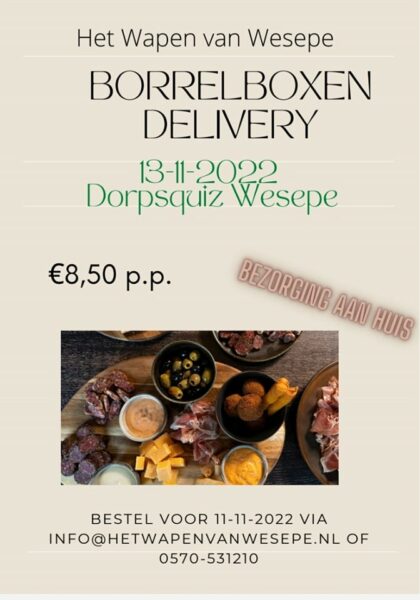 De DorpsQuiz staat voor verbinding. Samen met je groep binnen drie uur maar liefst 100 vragen maken en opdrachten uitvoeren. Geen tijd, geen tijd.. dus een goede voorbereiding is key! Daarom heeft Het Wapen van Wesepe borrelboxen samengesteld, speciaal voor de teams, die op locatie bezorgd kunnen worden. Dus laat de catering uit handen nemen en bespaar zeeën van tijd. Want die ga je nodig hebben.