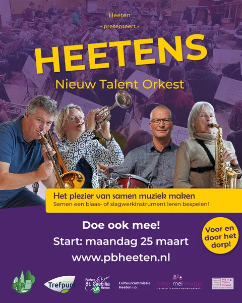 Ontdek het plezier van samen muziek maken. Heb je altijd al een blaas- of slagwerkinstrument willen leren bespelen? Of lijkt samen muziek maken je geweldig? Dan is dit je kans! In Heeten start het Heetens Nieuw Talent Orkest, een uniek muziekproject voor volwassenen. In tien repetities ervaar je hoe fantastisch het is om samen muziek te maken. De eerste repetitie is op maandag 25 maart, 19:45 uur in Kulturhus Trefpunt in Heeten. Dit belooft een bijzondere avond te worden onder de enthousiaste muzikale leiding van Guus Pieksma, initiatiefnemer van Nij Talint Orkest uit Sneek.