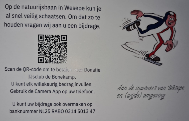 De Voorbereidingen voor het winterseizoen bij IJsclub de Bonekamp zijn inmiddels weer in gang gezet. De komende week kunt u bovenstaande kaart in de brievenbus vinden, waarmee u met een donatie de IJsclub kunt steunen. Alle gegevens hiervoor zijn ook te vinden in de tekst met QR-code hierboven.