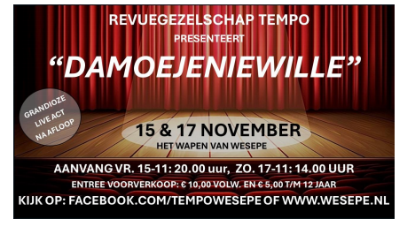 Revuegezelschap Tempo presenteert de eigentijdse voorstelling ‘Damoejeniewille’ op vrijdag 15 november (20:00 uur) en zondag 17 november (14:00 uur) bij Het Wapen van Wesepe. Een voorstelling over Wesepe, over de laatste nieuwtjes en wat al niet meer. Voor en door Wesepenaren, jong en oud, oud en nieuw! Entreekaarten kosten in de voorverkoop € 10,00 voor […]