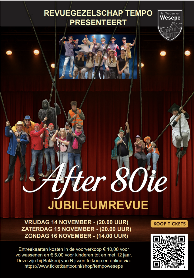Revuegezelschap Tempo speelt ter ere van haar 80 jarig bestaan de jubileumrevue ‘After 80ie’bij Het Wapen van Wesepe op: