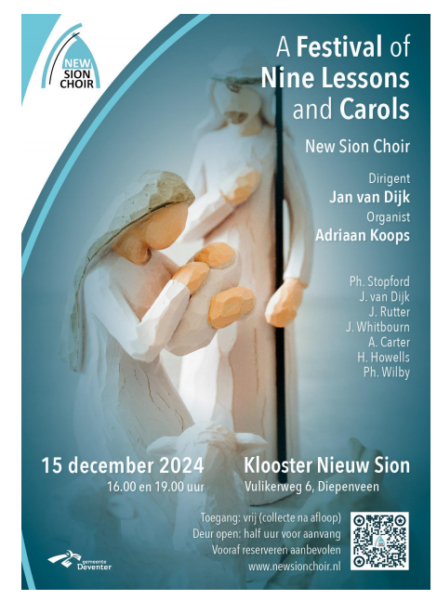 Het New Sion Choir zingt ‘A Festival of Nine Lessons and Carols’ Het New Sion Choir voert ‘A Festival of Nine Lessons and Carols’ uit in Klooster Nieuw Sion in Diepenveen. Afkomstig uit de Anglicaanse kerk, is dit inmiddels wereldwijd een geliefde traditie. Zondag 15 december 2024 om 16:00 uur en om 19:00 uur. Het ‘Festival of Nine Lessons and Carols’ is een kerstviering die traditioneel op Kerstavond plaatsvindt. Het Festival bestaat uit een combinatie van lessons (lezingen) en carols (liederen, voor koor- en samenzang) die samen het kerstverhaal vertellen. Deze vorm van viering werd voor het eerst bedacht en uitgevoerd in 1880 door Edward Benson en is misschien wel de meest populaire kerstviering aan het worden in onze Nederlandse kerken. Zondag 15 december wordt in Klooster Nieuw Sion twee keer het Festival of Nine Lessons and Carols gevierd, om 16:00 uur en om 19:00 uur. Een kerstervaring om niet te missen! Het New Sion Choir staat onder leiding van dirigent Jan van Dijk, de begeleiding wordt verzorgd door organist Adriaan Koops. Op het programma staan werken van onder anderen Ph.Stopford, J. Rutter, H. Howells en A. Carter. De muziek en samenzang zijn afwisselend van stijl, de lezingen zijn in het Nederlands. Toegang tot de vieringen is vrij; na afloop wordt via een deurcollecte een bijdrage gevraagd in de dekking van de kosten. Een half uur voor aanvang opent de deur van de kerkzaal in Diepenveen. In Diepenveen bevindt de nieuwe parkeerplaats zich op circa 5 minuten lopen vanaf de kerkzaal. Reserveren: Let op: gezien de verwachte grote belangstelling wordt vooraf aanmelden aangeraden. Door aan te melden bent u verzekerd van een plaats. De links om aan te melden vindt u in de agenda van New Sion Choir: