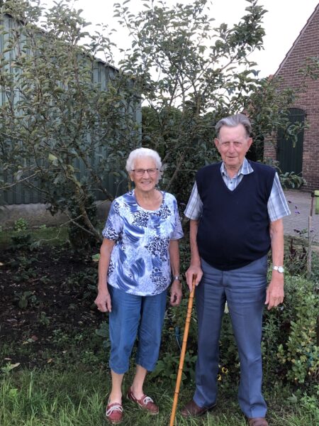 Afb. 4: Marietje Hulsegge (geboren 1937) en Jan Hulsegge (1934-2024) in 2022 bij de appelboom, die in 2015 samen met de familie Pruß is geplant.
