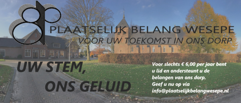 Plaatselijk Belang Wesepe is opgericht op 1 mei 1927 en heeft als doel de belangen van de inwoners van Wesepe en omgeving te behartigen. Het zou te ver voeren om al onze activiteiten te benoemen, maar denk bijvoorbeeld aan